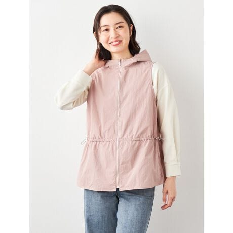 [型番:6251102]ナイロンタフタ素材のとても軽いフード付きベストです。春先に活躍するエアリー感のあるアウターです。ウエストはギャザーを寄せられる仕様になっています。軽くて薄いナイロン素材なので畳んでバックの中にしまって持ち歩いても重さが気になりません。長時間の外出・旅行にも最適です。