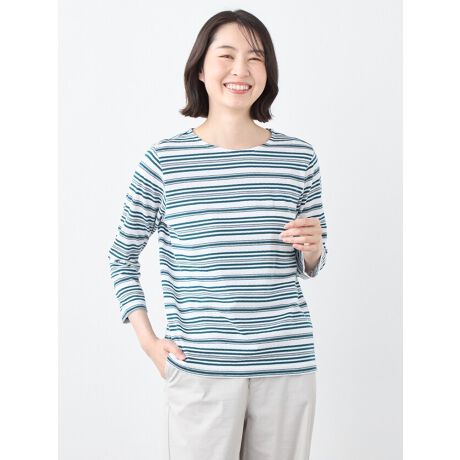 [型番:6251716]綿100%の軽く柔らかな風合いが特徴的なボーダープルオーバーです。ボーダーの中にレースジャガードを組み合わせた特殊な編み方のオリジナル生地です。ベーシックで着やすい形に主張しすぎない透け感がマッチして上品でフェミニンな印象を与えます。他にはない価値のある1枚です。