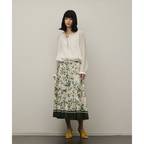 [型番:0326201311]変わり織のカラミ素材を使用したノーカラージップブルゾン。同型でおつくりしたドットフロッキーブルゾン【品番:0326201312】のご用意もございます。※こちらのモデル着用画像はサンプル品を撮影しております。実際の商品と仕様、加工、サイズが若干異なる場合がございます。予めご了承くださいませ。