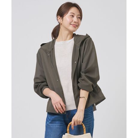 ■デザインきれいめなディテールと透け感のある素材で仕立てた、大人の女性に似合うフーデッドジャケット。ゆとりのあるAラインシルエットと短めの丈感で、ワイドパンツやロングスカートともバランスよく決まります。裾のドロストコードを絞れば、丸みのあるフェミニンなフォルムに変化し、よりすっきりとしたショート丈としても着用いただけます。フードの紐をなくし、フロントには小さめの金属ドット釦をあしらうことで、スポーティさを抑えた上品な印象に仕上げました。袖口の内側にはゴムが入っており、さっとたくし上げてアレンジしやすいのも魅力。日除けや冷房対策として、気軽に羽織れる軽やかな1枚で、季節の変わり目に重宝します。カラーは、肌なじみが良く洗練された印象のサンドベージュ(#033)、落ち着きのある大人カジュアルな印象のカーキ(#054)、品よく引き締まるネイビー(#075)の3色展開です。
