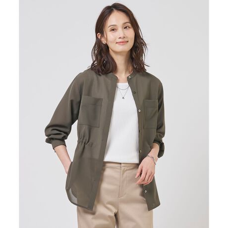 ■デザインノーカラーですっきりと仕上げ、フロントポケットでアクセントを加えたシアーブラウス。手首がのぞく短めの袖丈が、大人の女性らしい抜け感を演出します。ウエストの内側にドロストコードを施しており、きゅっと絞ってメリハリのあるシルエットにしたり、緩めてリラックス感を出したりと、気分に合わせて調整いただけます。釦を開ければ軽い羽織りとしても着用でき、季節の変わり目や冷房対策にも重宝する優秀な1枚です。カラーは、肌なじみが良く洗練された印象のサンドベージュ(#033)、落ち着きのある大人カジュアルな印象のカーキ(#054)、品よく引き締まるネイビー(#075)の3色展開です。