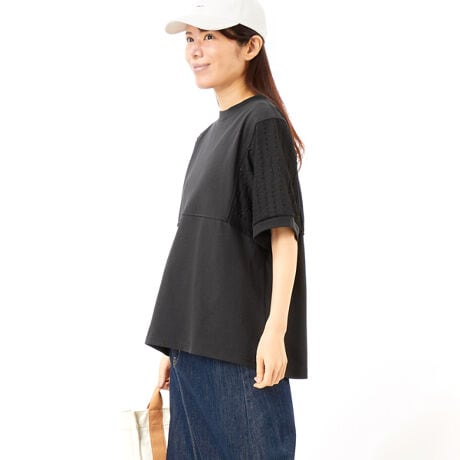 肩周りのジャガードのレース素材で涼しさと抜け感をプラス。