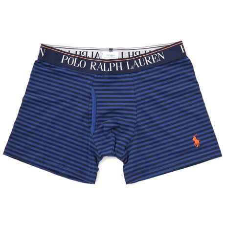 [型番:RM3-D101]オーガニックコットンを使用したコットンストレッチボクサーブリーフです。柔らかな質感と伸縮性を兼ね備えた快適な着心地が特長。ネイビーとブルーをベースにしたストライプ柄で、左裾に入れたブランドアイコンのポロプレイヤー刺繍もポイントです。前開き仕様。