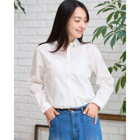 異なる織り地を組み合わせることで、表情豊かに仕上げた切替ブラウス。