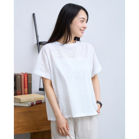 綿ポリエステル天竺と繊細なレースを組み合わせた、異素材使いのプルオーバーです。