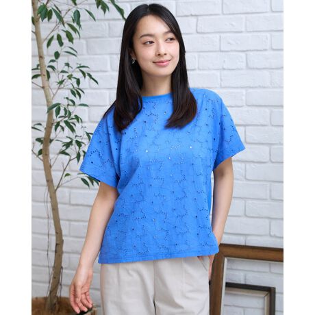 綿ポリエステル天竺と繊細なレースを組み合わせた、異素材使いのプルオーバーです。