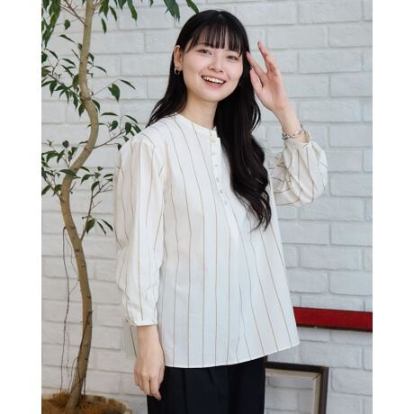 肌に優しいオーガニックコットンを使用。凹凸感のあるストライプが豊かな表情を生むスタンドカラーブラウスです。