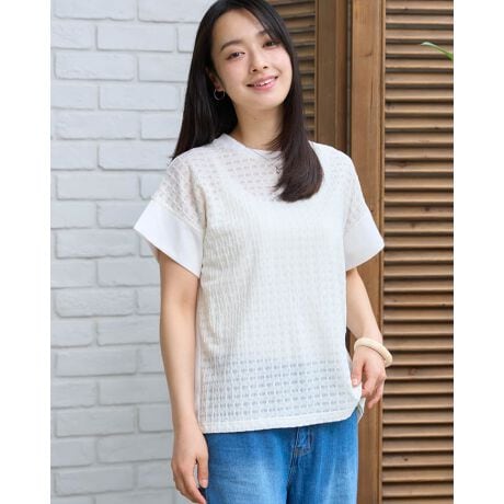 吸水速乾機能を持つ綿ポリエステル天竺と、前身頃のレース切り替えが目を惹くカットソーです。