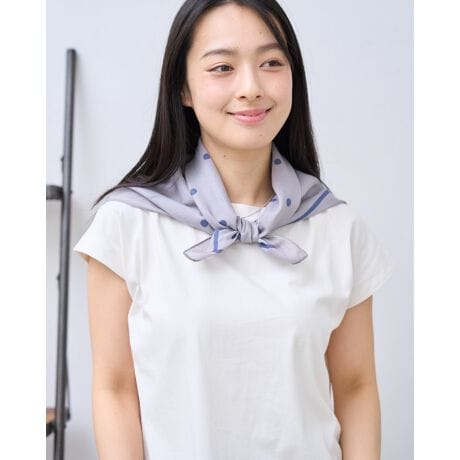 65cm四方のサイズ感は首元に添えやすく、トレンドの巻き方もバランスよく楽しめるため、4月の爽やかなコーディネートに最適です。