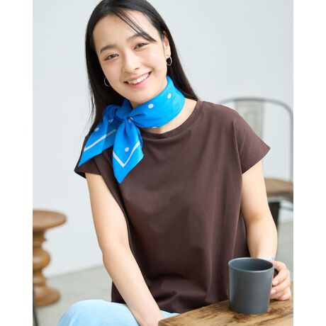 65cm四方のサイズ感は首元に添えやすく、トレンドの巻き方もバランスよく楽しめるため、4月の爽やかなコーディネートに最適です。