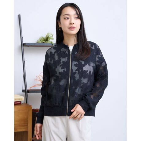 コットンタッチのメッシュ生地に花柄モチーフを編み込んだ、透け感が軽やかで上品なZIPアップカーディガン。
