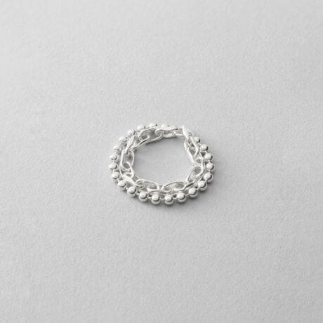 大小のボールチェーンを二連で組み合わせた、立体感のあるリング。