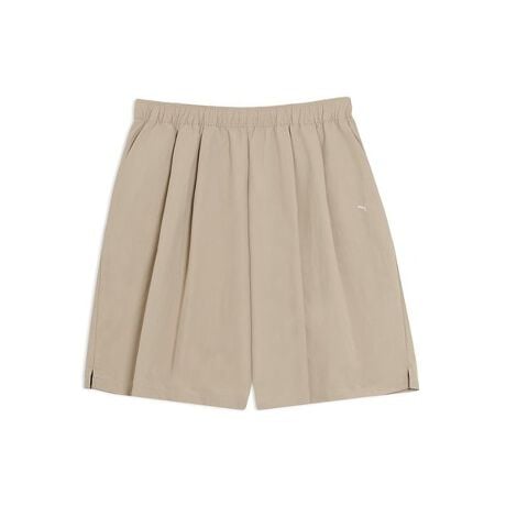 ワイドなシルエットが特徴的なシルエットであるがウェストにタックを入れることでスポーツでよく使われるタスラン(ワッシャー)素材を使用しながらライフタイルになじむ見え方に。ウェストはゴムスピンドルにすることでスポーツ由来の雰囲気を持ったアイテムに