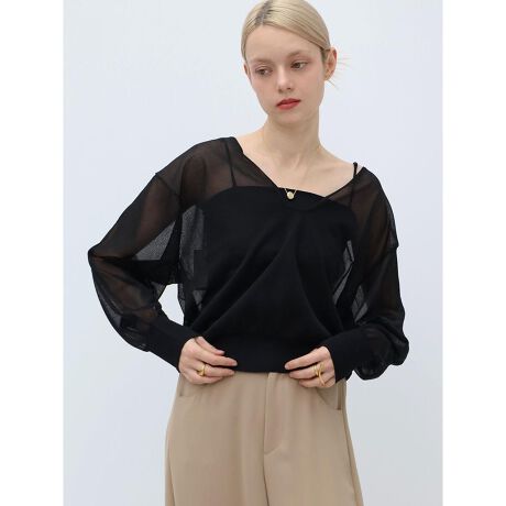 清涼感あるシアー素材と深く開いたネックラインが大人な抜け感を与えるニットトップス。上品なドレープ感がありながらもゆったりとしたリラクシーなシルエットが魅力的。程よい透け感がレイヤードスタイルに映え、抜け感のあるスタイリングを完成させます。