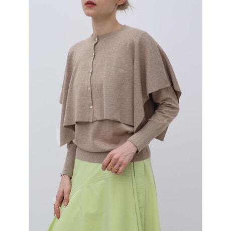 ケープとトップスがセットになったアンサンブルアイテム。スタイリングや気分に合わせて取り外しが可能。ケープとトップスそれぞれのボタンデザインがワンカラーの中にメリハリをプラス。コーディネートの幅が広がり、着るだけで上級者なレイヤードスタイルが完成します。