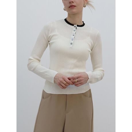 首元に配された鮮やかなバイカラーがアクセントになるリブニット。 フロントボタンの開閉によって魅せ方に変化を与えてくれます。身体のラインを美しく見せるコンパクトなシルエットに加え、一枚着るだけでレイヤード風のこなれ感が叶うのもポイント。ジャケットやカーディガンのインナーとしても幅広く活躍する汎用性の高さが魅力のアイテムです。