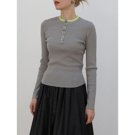 首元に配された鮮やかなバイカラーがアクセントになるリブニット。 フロントボタンの開閉によって魅せ方に変化を与えてくれます。身体のラインを美しく見せるコンパクトなシルエットに加え、一枚着るだけでレイヤード風のこなれ感が叶うのもポイント。ジャケットやカーディガンのインナーとしても幅広く活躍する汎用性の高さが魅力のアイテムです。