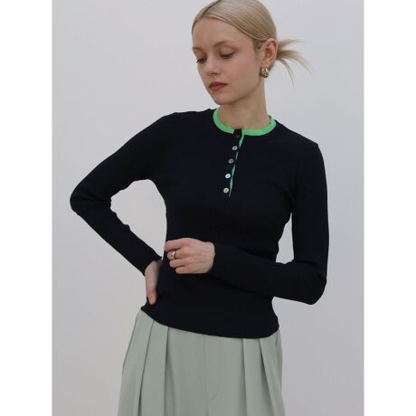 首元に配された鮮やかなバイカラーがアクセントになるリブニット。 フロントボタンの開閉によって魅せ方に変化を与えてくれます。身体のラインを美しく見せるコンパクトなシルエットに加え、一枚着るだけでレイヤード風のこなれ感が叶うのもポイント。ジャケットやカーディガンのインナーとしても幅広く活躍する汎用性の高さが魅力のアイテムです。