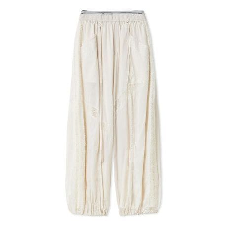 シボ感を加えて柔らかな表情を出したUV加工のナイロン生地のワイドパンツに、繊細なフラワーレーステープを流れるラインのようにドッキングさせてヘルシーな抜け感を出し、女性らしく軽やかな仕上がりに。裾口にはゴムのドロストを施しているのでバルーンシルエットにアレンジ可能です。