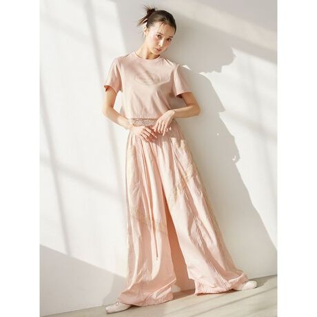 シボ感を加えて柔らかな表情を出したUV加工のナイロン生地のワイドパンツに、繊細なフラワーレーステープを流れるラインのようにドッキングさせてヘルシーな抜け感を出し、女性らしく軽やかな仕上がりに。裾口にはゴムのドロストを施しているのでバルーンシルエットにアレンジ可能です。