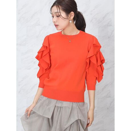 肩のラインから流れるようにあしらったラッフルディテールが、装いに華やぎを添えるサマーニット。
