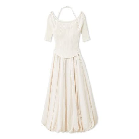 バレエコアな雰囲気を醸す半袖リブニットと、SNIDELらしいふんわりバルーンスカートをドッキングした、1枚で着映えるカップインニットバルーンワンピースが届きました。