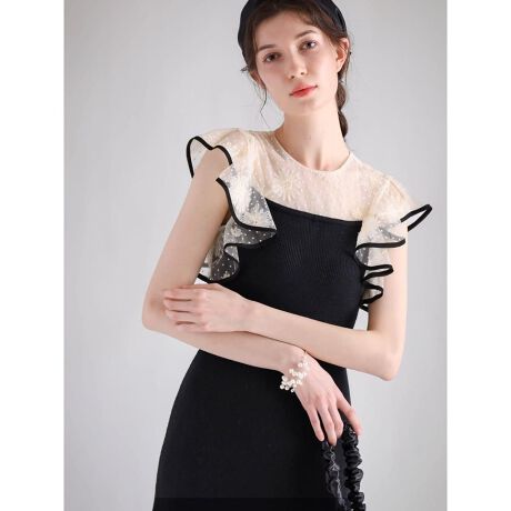 黒のパイピングを利かせたフレアスリーブも存在感を放ち、本体のニット素材は身体のラインを綺麗にみせてくれます。