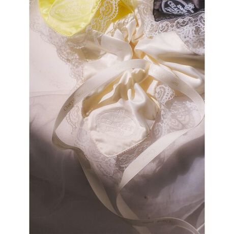 程よい光沢感のある生地にスカラップレースを重ねたフェミニンなシュシュ。