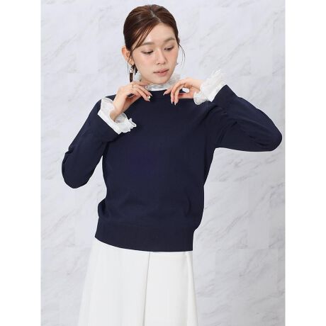裾と袖口にあしらわれたフリルが女性らしい優雅さを際立たせるニットトップス。