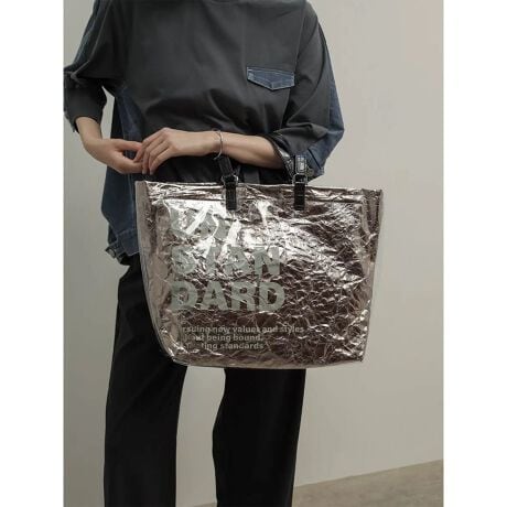 クラッシュメタリック素材の上に、ハリのあるクリアPVCを重ねた存在感のあるトートバッグ。