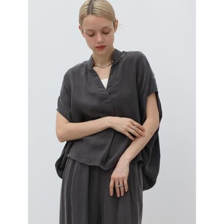 無駄を削ぎ落したミニマルなデザインが、素材の上質さを引き立たせるブラウス。背中からヒップに沿って丸みを帯びた女性らしいシルエットに、首元はキーネックデザインでさりげなく抜け感をプラス。軽やかな素材感でゆったりとしたドルマン型がリラクシーな着心地を叶える、汎用性の高いブラウスです。