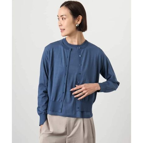 シアーで薄手のニットを、配色で二重に編み立てたカーディガン。裏側のカラーがほんのり透けることで、奥行きのあるニュアンスカラーに仕上げました。同素材のプルオーバーとのアンサンブルスタイルも楽しめます。40サイズは限定店舗展開です。