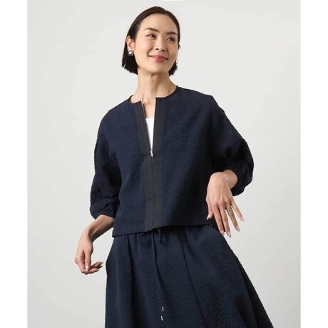 同素材のスカートと合わせてセットアップ風に着こなせば、上品なコーディネートが完成。デイリーからちょっとしたお出かけまで、幅広いシーンで活躍します。前を開けて羽織れば、程よい抜け感のある大人スタイルに。袖のボリュームが、装いにさりげない華やかさをプラスします。