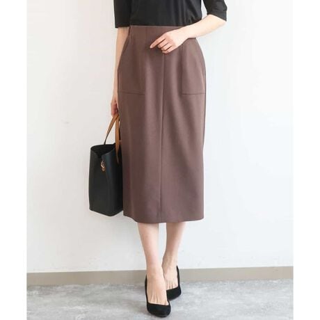 パッチポケットをポイントにしたシンプルなデザインのタイトスカート。フロントはベルトレスのすっきりとしたデザインで、後ろのベルトは切り替えてゴムを入れているので安定感のある着心地です。