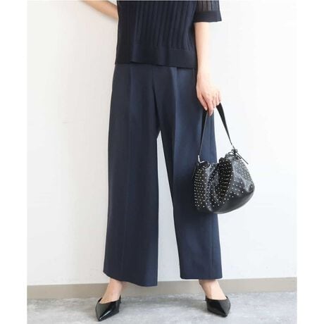 センタープレス入りできちんと見えのワイドストレートパンツ。2タックのデザインでお腹周りをカバー、後ろウエストはゴム入りなのでイージーな履き心地も嬉しいポイントです。