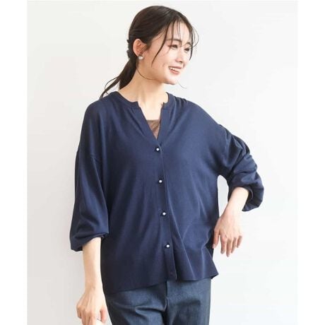 顔周りをすっきりと見せるキーネックラインと、女性らしいパフスリーブが目をひくミドル丈のニットカーディガン。フロントには小さな丸いメタル釦を配置し、アクセサリー要らずの華やかさに仕上げました。