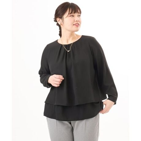 内側の1段をボトムにインしてジャケットを羽織れば、ブラウスの裾がジャケットから見えにくく、すっきりとした着こなしが完成します。