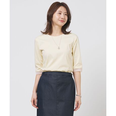 ■デザイン襟元と袖口にシアー素材をあしらい、さりげない透け感で軽やかさをプラスしたカットソー。今年は袖部分のシアー範囲を広めに設定し、シンプルながらもトレンド感のあるデザインに仕上げました。季節の変わり目にちょうどよい6分袖なのも嬉しいポイントです。ジャケットやカーディガンのインナーとしてはもちろん、1枚着としても存在感を放つアイテムに仕上げました。同型でボーダー柄も展開しています。カラーは、清潔感のあるホワイト(#001)、上品で落ち着いた印象のグレージュ(#003)、合わせやすいブラック(#005)、差し色になるイエロー(#042)の4色展開です。