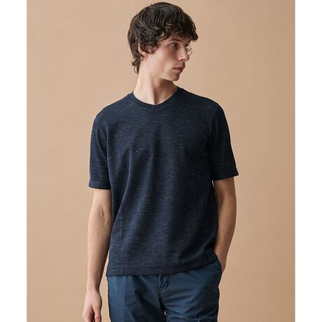 襟元を同色のニットパーツで丁寧に編み立てたVネックTシャツです。Tシャツでありながら上品な印象を与え、ジャケットのインナーとしても一枚着としても様になるデザインです。