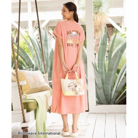 [型番:4CA-6134-2026]【Kahiko×Aloha Mapua】サーフィンとファッションをこよなく愛するキャラクター「Aloha Mapua(アロハマプア)」のワンピース。カラフルなサンセットを背景にしたプリントがポイントです。肩が隠れるほどの袖丈でリラックス感があり、便利なポケット付き。やわらかなパイル生地が心地よく、ルームウェアとしてもおでかけにもぴったりな一枚です。
