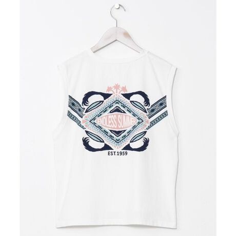[型番:4CA-6127-2026]UVカット機能と吸湿速乾性を兼ね備えたノースリーブトップス。ヴィンテージ風のプリントが程よい存在感を放ち、さらっと快適な着心地。デニムやスカートにも合わせやすい万能アイテムです。吸水速乾生地/UVカット加工