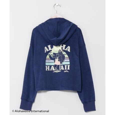 [型番:4CA-6133-2026]【Kahiko×Aloha Mapua】サーフィンとファッションをこよなく愛するキャラクター「Aloha Mapua(アロハマプア)」のフードトップス。カラフルなサンセットを背景にしたプリントが魅力のデザインです。短丈シルエットにポケット付きで軽やかな印象。やわらかなパイル生地が心地よく、リラックスタイムやおでかけにもぴったりな一枚です。