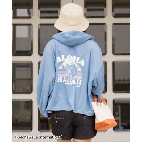 [型番:4CA-6133-2026]【Kahiko×Aloha Mapua】サーフィンとファッションをこよなく愛するキャラクター「Aloha Mapua(アロハマプア)」のフードトップス。カラフルなサンセットを背景にしたプリントが魅力のデザインです。短丈シルエットにポケット付きで軽やかな印象。やわらかなパイル生地が心地よく、リラックスタイムやおでかけにもぴったりな一枚です。