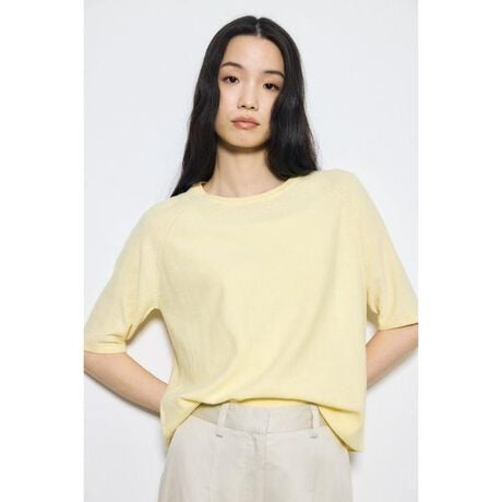 ■カシミヤミックスハーフスリーブニット■ポイントカシミヤ混素材の上質な風合いを活かした、シンプルで着回し力の高い5分袖トップス。程よい袖丈とミニマルなデザインで、季節の変わり目にも活躍する大人カジュアルな1枚です。■ディテールカシミヤをミックスした、柔らかくなめらかな肌触りが魅力の素材を使用。薄手ながらも上品な表面感とほどよい温かみがあり、ロングシーズン着用可能です。身体のラインを拾いにくいシルエットで、1枚でも安心感のある着心地に。シンプルなクルーネック仕様で、シリーズアイテムとも合わせやすいバランスに仕上げています。■スタイリング同素材のカーディガンを羽織ったアンサンブル風スタイルがおすすめ。スラックスやスカートと合わせてきれいめに、デニムと合わせてカジュアルにも着回し可能。5分袖デザインのため、1枚着としてはもちろん、ジャケットや羽織のインナーとしても活躍します。■生地2/48の細番手カシミヤミックスのコットン素材を、さらに風合いが14GGのハイゲージ。固くならない限界まで度目を詰めることにより、最終洗いと仕上げにてソフトな風合いを可能にしました。透け感:なし裏 地:なし伸縮性:あり光沢感:なし[注意事項]※画像の商品はサンプルです。実際の商品と仕様、加工が若干異なる場合があります。※画像の商品は光の照射や角度、お使いのモニター環境により、実物と色味が異なる場合がございます。※着用、お取り扱いの際は、アテンションタグをご確認ください。