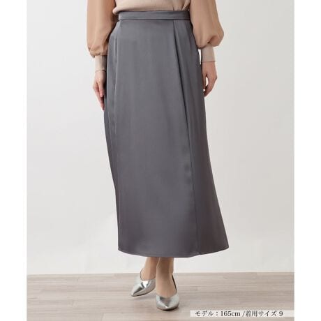 上品な光沢感としなやかな落ち感を併せ持つ、サテン素材を使用したロングスカート。生地を贅沢に使い、裾に向かって緩やかに広がるフレアシルエットがドラマティックな揺れを演出し、大人の女性らしさを引き立てます。バックウエストをゴム仕様にすることで、快適な穿き心地を叶えつつ、フロントはすっきりと端正な見え方に仕上げました。さらりとした質感のやや薄手の生地は適度な伸縮性も備えており、足捌きが良く動きやすいのも嬉しいポイント。サイドホック&ファスナーにより開閉が可能。