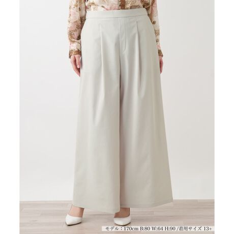 ウエストから深く入ったタックが、スカートのようにも見えるほど豊かなボリュームを生み出し、裾に向かって美しく流れるシルエットを描きます。ほどよいハリ感と落ち感を両立した生地は、体の動きに合わせて優雅に揺れ、上品なドレープを演出します。幅広のウエストデザインが腰の位置を高く見せ、トップスをインする着こなしもすっきりと決まります。脚のラインを拾わないワイドなフォルムが、エレガントな佇まいと心地よい着用感をもたらす一本です。
