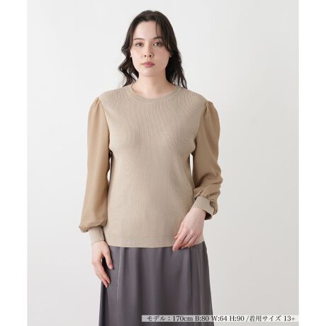 縦のラインがすっきりとした印象を与えるリブ編みの身頃は、程よく身体に寄り添い、美しいシルエットを描きます。対照的に、袖にはほのかな透け感を持つ軽やかな生地を使用し、肩に寄せたギャザーと袖口のフィット感が、ふんわりと立体的なフォルムを生み出します。身頃のシャープな質感と、袖の柔らかなボリューム感とのコントラストが、一枚でメリハリのある装いを完成させます。シンプルなクルーネックが全体のバランスを品良くまとめ、デザイン性の高さを引き立てる一着です。