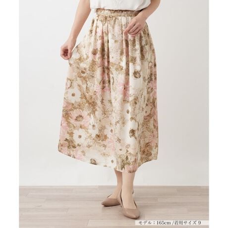 大胆なフラワープリントが初夏の陽光に美しく映える、華やかなフレアスカート。計算されたタック使いによって生まれるボリューム感のあるシルエットがドラマティックな揺れを演出し、女性らしさを引き立てます。ウエストの背面はゴム仕様になっており、リラックスした穿き心地ながらフロントはすっきりと端正な見え方に。シンプルなブラウスやカットソーと合わせるだけで、気品漂うエレガントなコーディネートを完成させてくれます。