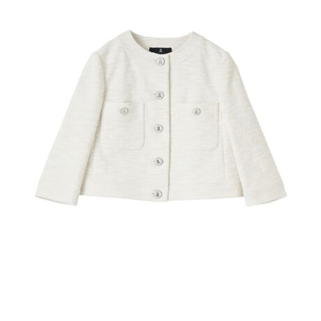 首周りをすっきりと見せるノーカラーとパッチポケットで、程よい抜け感をプラス。ジュエリーのように輝くエポキシボタンが装いを彩ります。裏地を排し、4mm巾の繊細なパイピング始末を施すなど、見えない部分の美しさにも配慮した一着です。現代の女性が美しく見えるよう追求されたシルエットが、品格あるスタイルを演出します。