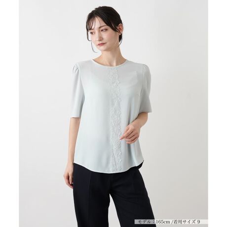 フロントに施された繊細なレースが、お顔周りに上品な華やぎと清潔感を添えるブラウス。さらりとした薄手の素材感は肌離れが良く、初夏の汗ばむ季節でも軽やかで快適な着心地を叶えてくれます。袖口にギャザーを寄せたスリーブが二の腕周りを優しくカバーしつつ、女性らしい柔らかなシルエットを演出。バックネックの涙あきはスナップボタン仕様になっており、着脱のしやすさとバックスタイルのすっきりとした見え方を両立しています。
